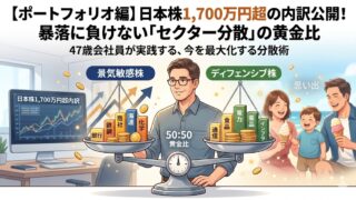 日本株1,700万円超のリアルなポートフォリオを公開!三菱UFJや商社株などの「景気敏感株」と、通信などの「ディフェンシブ株」を50:50で持つ黄金比とは?特定の業種に偏らない「10%ルール」で暴落リスクを抑え、家族との思い出資金を安定して稼ぐ分散術を47歳会社員が徹底解説。