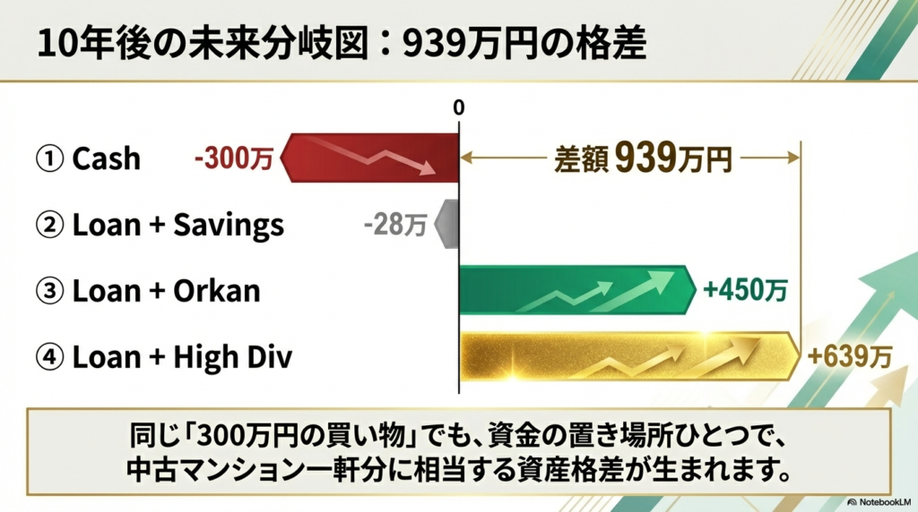 - キャッシュ一括: 資産は0円。300万円の純粋な「消費」。