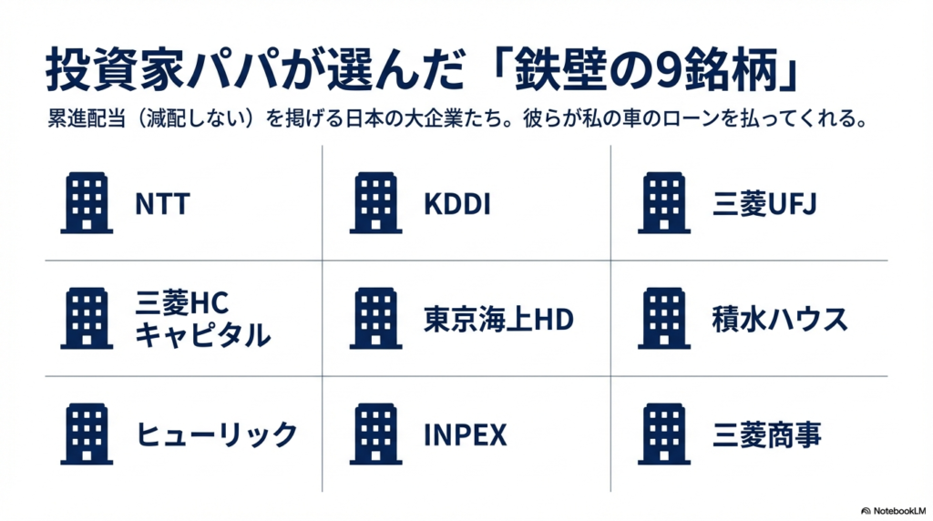 私が実際に保有している、日本を代表する配当銘柄9社に均等投資します。