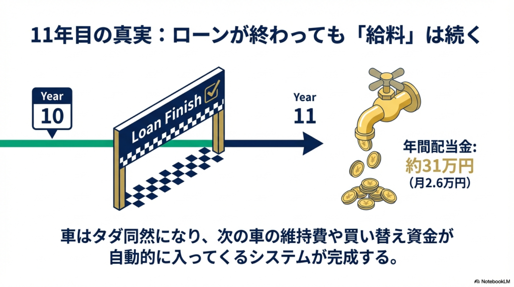 ローン完済後の11年目。車は手元に残り、支払いはゼロ。それどころか、育て上げた高配当株ポートフォリオからは**年間約31万円(月2.6万円)の配当金が届きます。 つまり、11年目からは「実質、タダで次の車の維持費や買い替え代を準備できている」**状態になるのです。これが投資家目線の「負けない車の買い方」の正体です。
