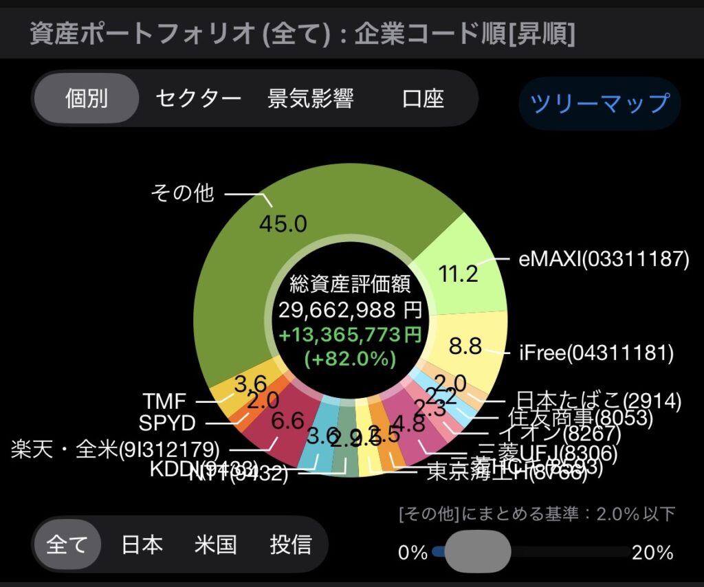 現在、現預金を除いた私の投資資産総額は約 2,966万円。そのうち、実に約1,336万円が「含み益(評価益)」です。つまり、資産の約 45%が運用によって増えた分ということになります。