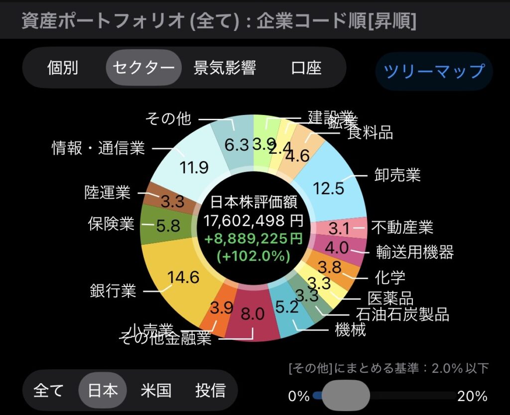 - 現在の状況: 足元では銀行株や商社株が大きく上昇しており、私のポートフォリオでもこれらのセクターの保有比率は一時的に 10% を超えています。
