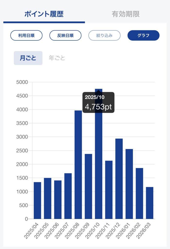 ※毎月勝手にポイントが貯まっていくのは、かなりの快感です!(ゴールドカードの使用期間は1年未満)