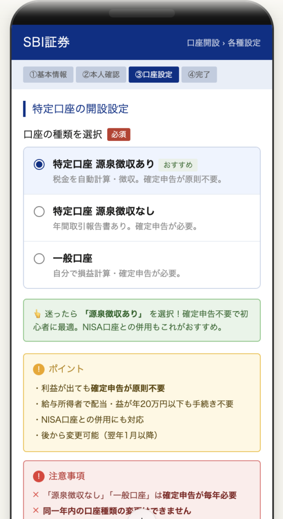 これを選んでおけば、株で利益が出ても面倒な確定申告をSBI証券が代わりにやってくれます。(※楽天証券でも同じ設定にしているはずです)。 私たちのような忙しい会社員・子育て世代は、迷わずこれ一択です!