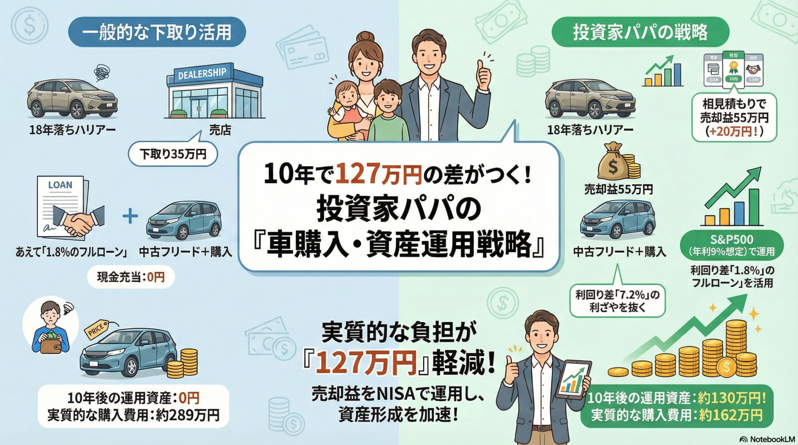 「愛車の買い替え。今乗っている車のディーラーの査定に納得がいかない。でもローンは怖い……。そんな悩みを抱えるパパに向けて、私が実践した『家計に127万円の差をつける乗り換え術』を公開します。」